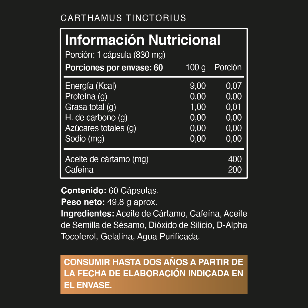Aceite de Cártamo + Cafeína + Aceite de Sésamo + Silicio + Alphatocoferol Es una fórmula potente que promueve la pérdida de grasa corporal y ayuda a modelar la figura. El aceite de cártamo contiene elementos que reducen el apetito, aceleran el metabolismo de los lípidos, contribuyen a la pérdida de peso y reducen el colesterol LDL en el ser humano. La cafeína como componente mejora la concentración, ayuda al estado de ánimo y mantenerse despierto.