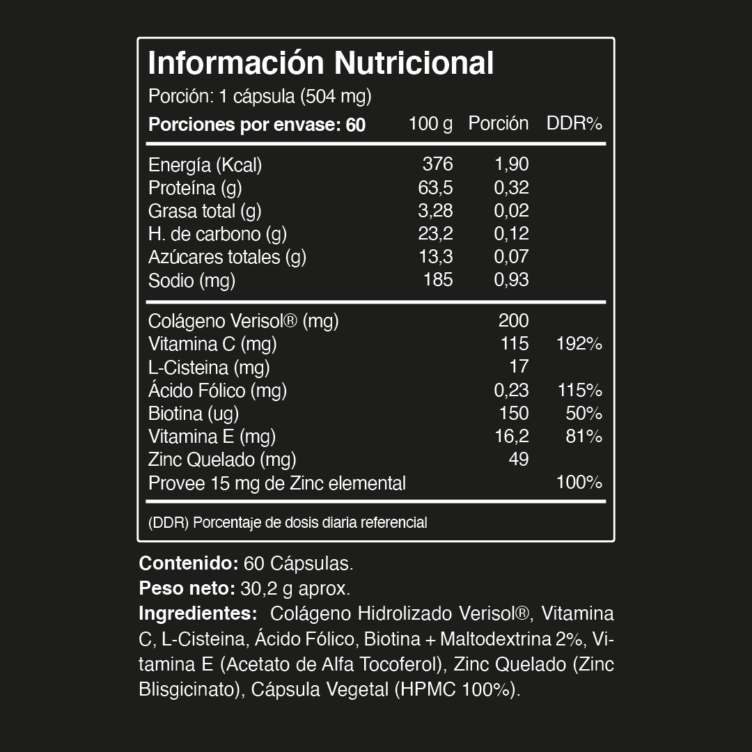 Péptidos de colágeno Verisol + Vitamina C + Cistina + Vitamina E + Zinc + Ácido Fólico + Biotina Restaura la piel sometida a agresiones ambientales como la contaminación, el stress, el daño solar y el cigarrillo. Tiene muchos de los efectos descritos arriba para Vit. C.
