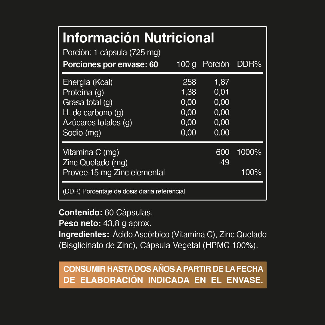 Refuerza el sistema inmune, favorece crecimiento de pelo y uñas, mejora la calidad de la piel y mucosas, incrementa la cicatrización de heridas y retrasa el envejecimiento cutáneo. Es excelente antioxidante y protege del daño celular causado por radicales libres y favorece la respuesta inmune ante resfríos y enfermedades virales.